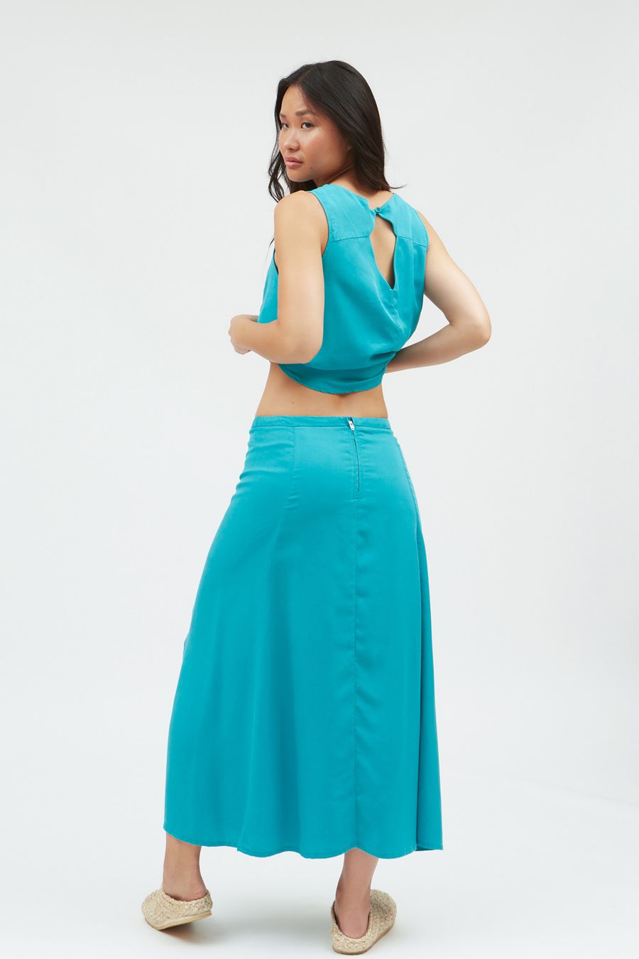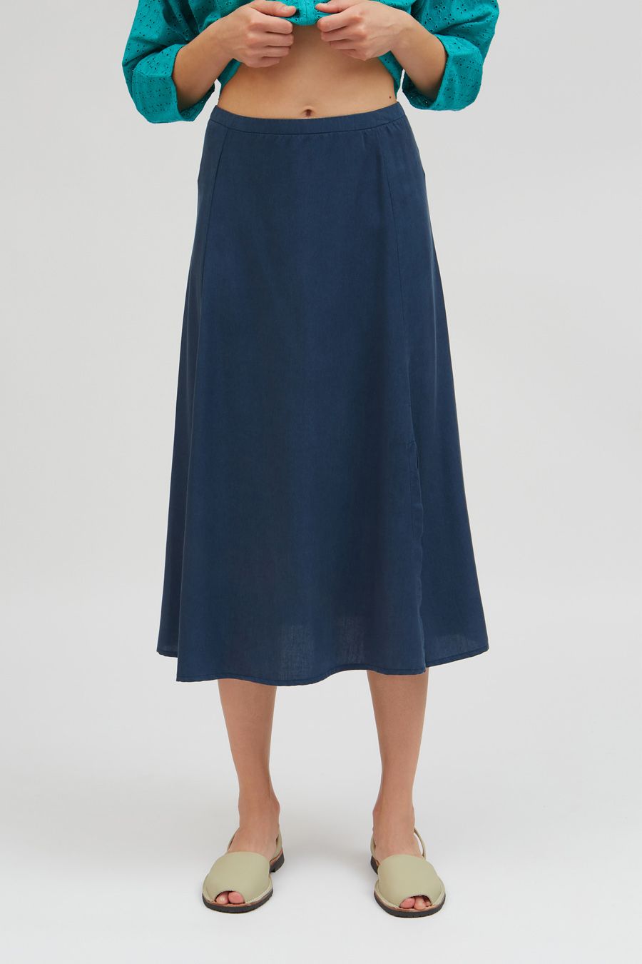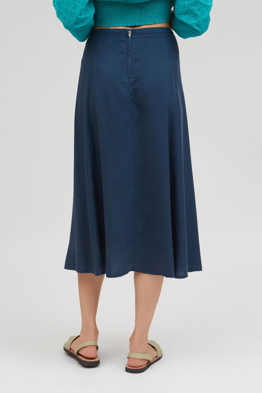 Revitalize your wardrobe with our chic high-waist midi skirt, crafted from 100% Livaeco viscose for both style and sustainability. Featuring a sleek silhouette and a modern side slit at the hem, this skirt adds a touch of sophistication to any ensemble. Secured with a hidden metallic zip closure on the back, it offers a seamless fit and effortless elegance. Elevate your look with our eco-friendly midi skirt, designed for both fashion and conscience.