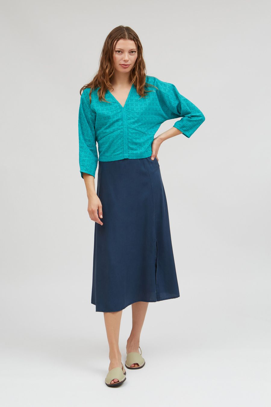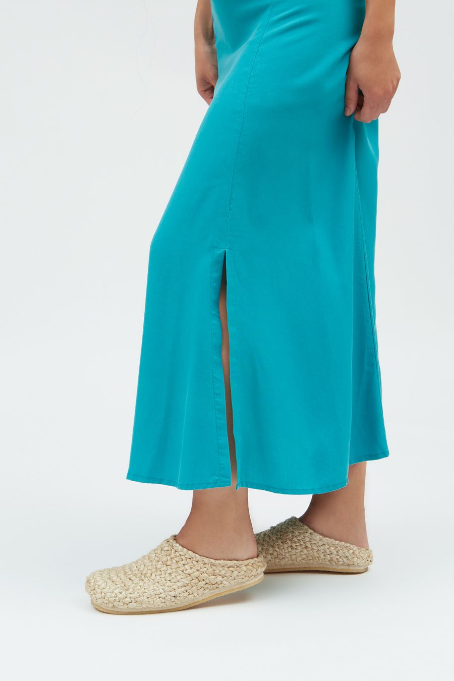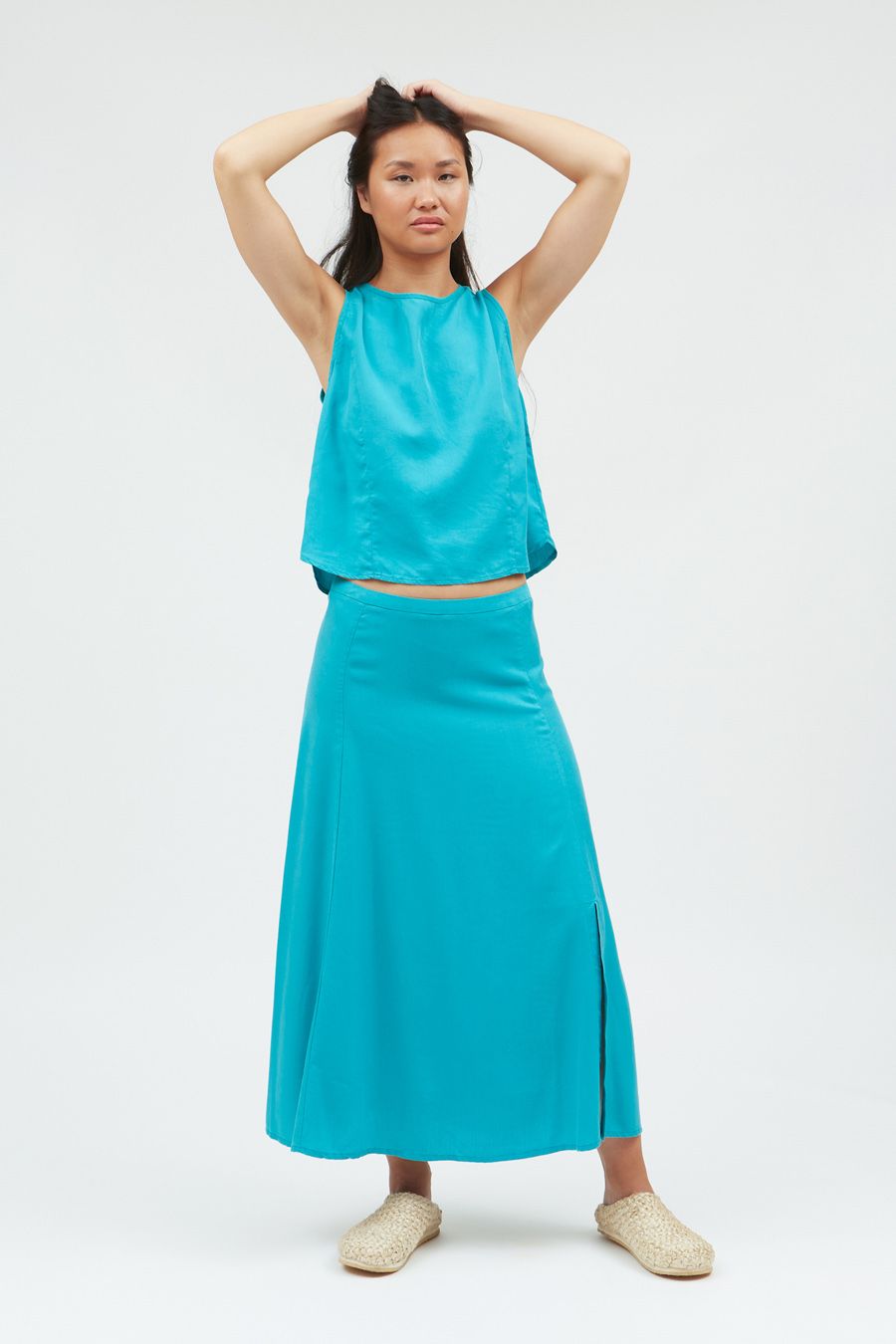 Revitalize your wardrobe with our chic high-waist midi skirt, crafted from 100% Livaeco viscose for both style and sustainability. Featuring a sleek silhouette and a modern side slit at the hem, this skirt adds a touch of sophistication to any ensemble. Secured with a hidden metallic zip closure on the back, it offers a seamless fit and effortless elegance. Elevate your look with our eco-friendly midi skirt, designed for both fashion and conscience.