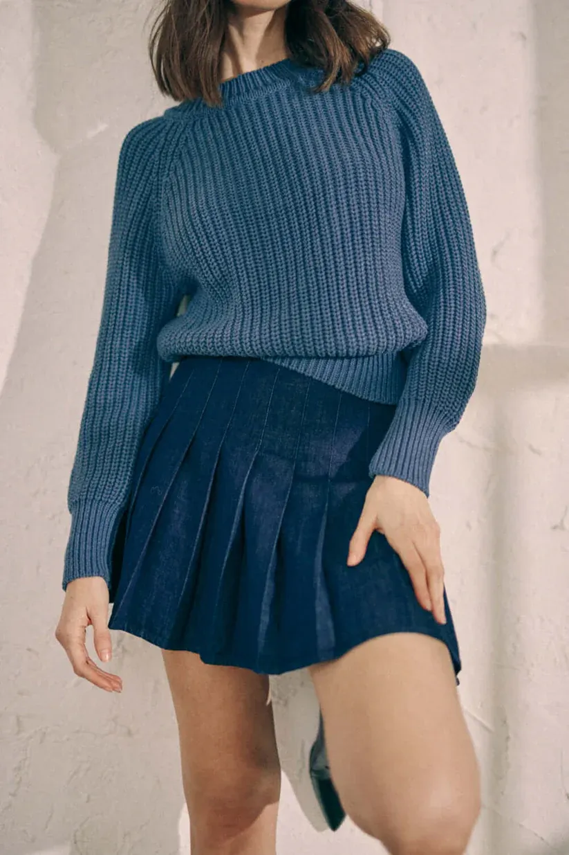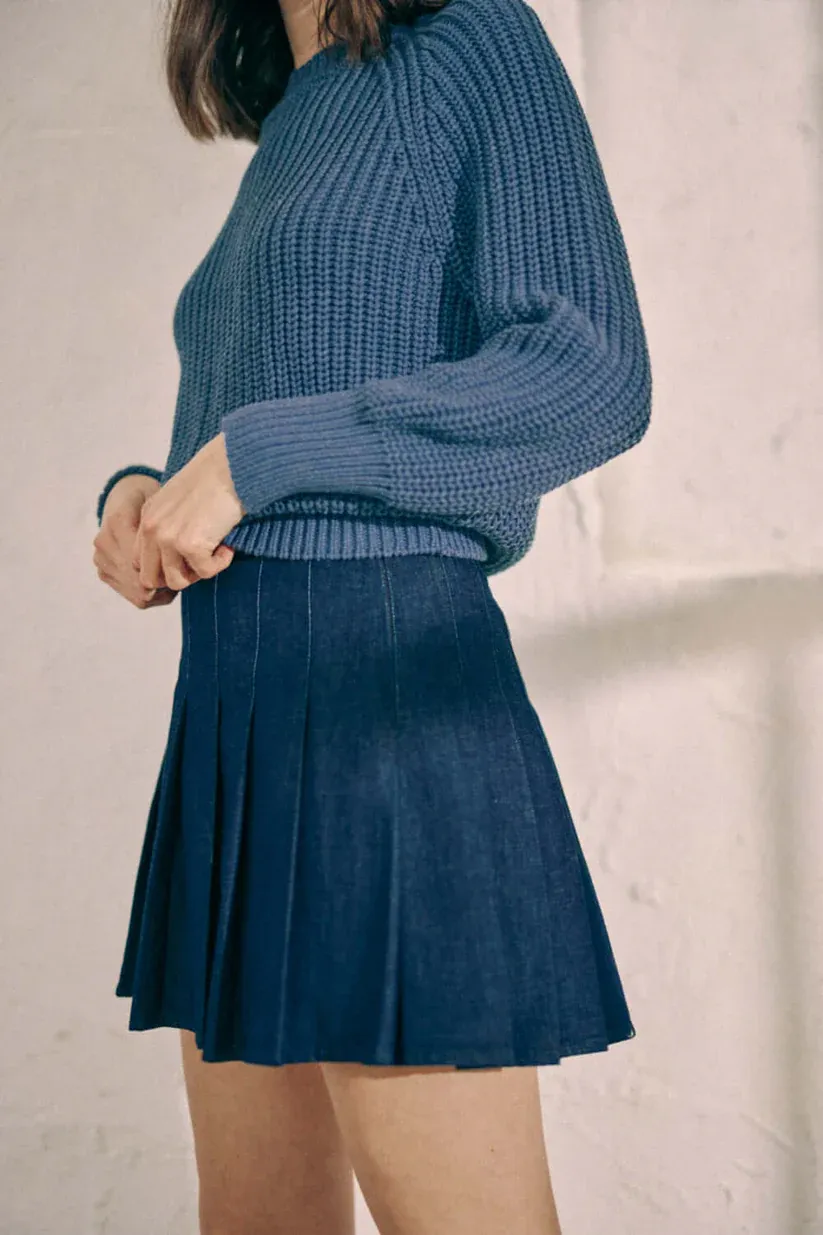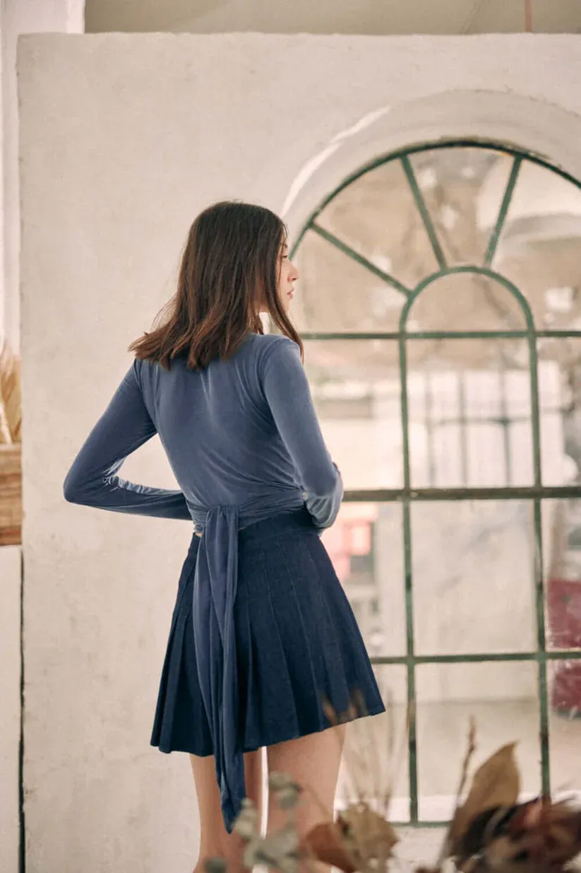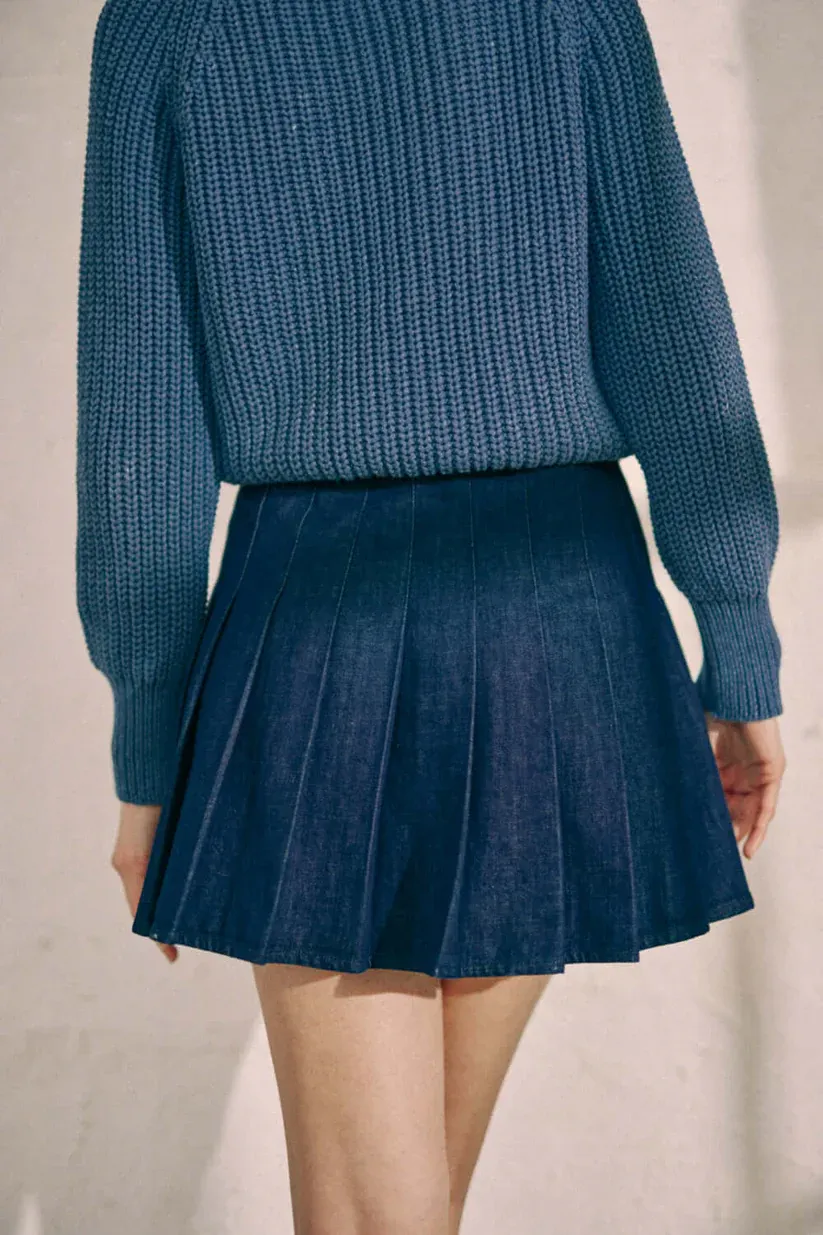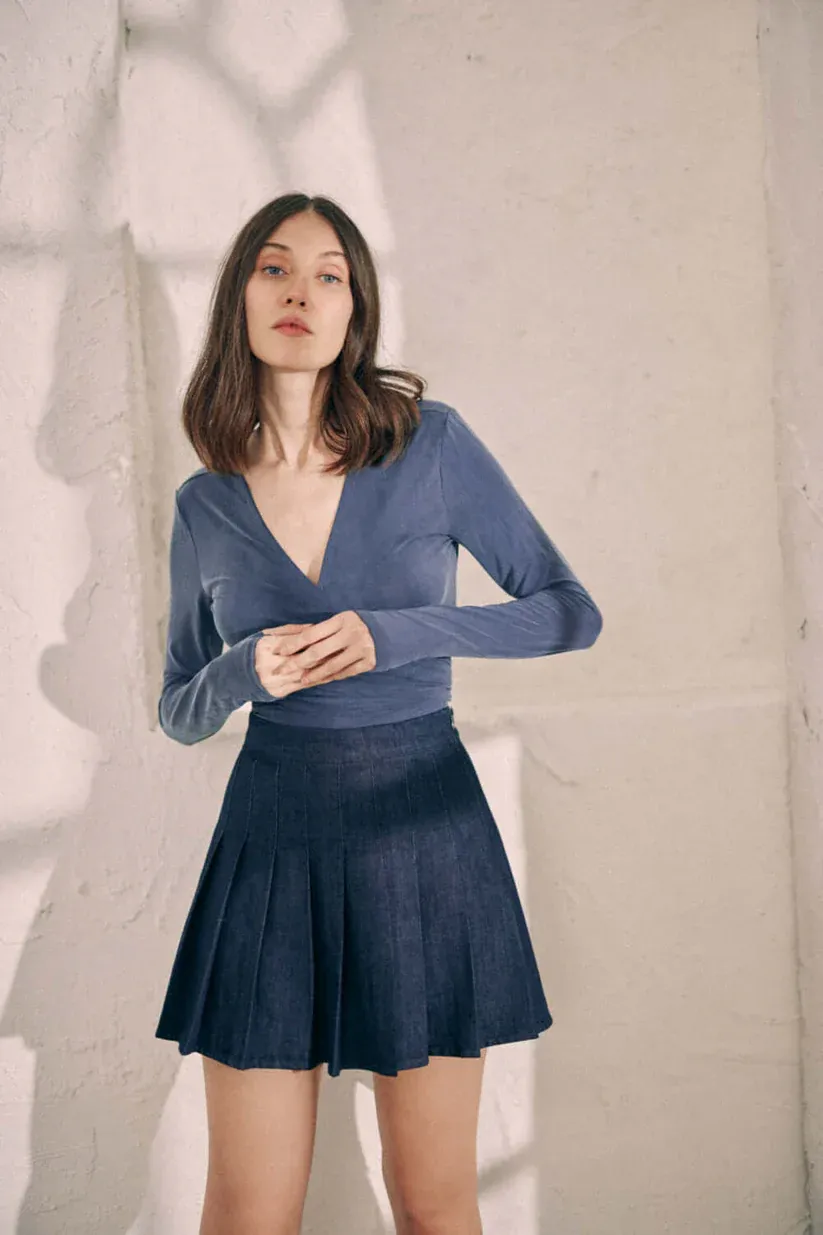 Elevate your modern preppy style with this mini denim pleated skirt. Perfect for a fresh, timeless look, it pairs effortlessly with our denim jacket or sleek cupro wrap top.