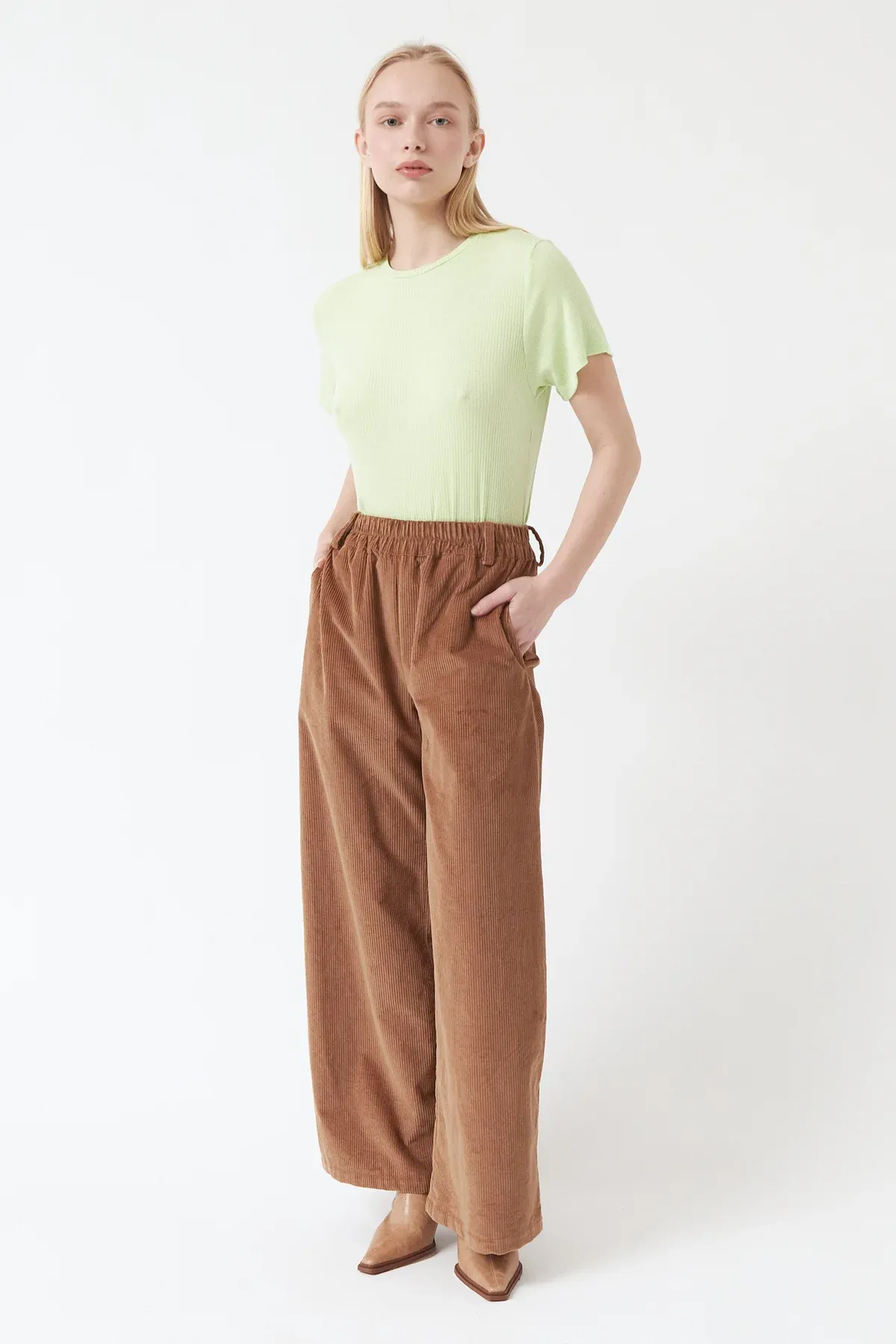 Timeless wide-leg corduroy trousers with an elastic waistband and pockets for everyday comfort. Made from 100% organic cotton, they combine texture, warmth, and effortless style. Their relaxed yet flattering fit makes them perfect for winter layering. Pair with a shirt for a polished look or a simple tee for laid-back vibes — finished with sneakers or boots.