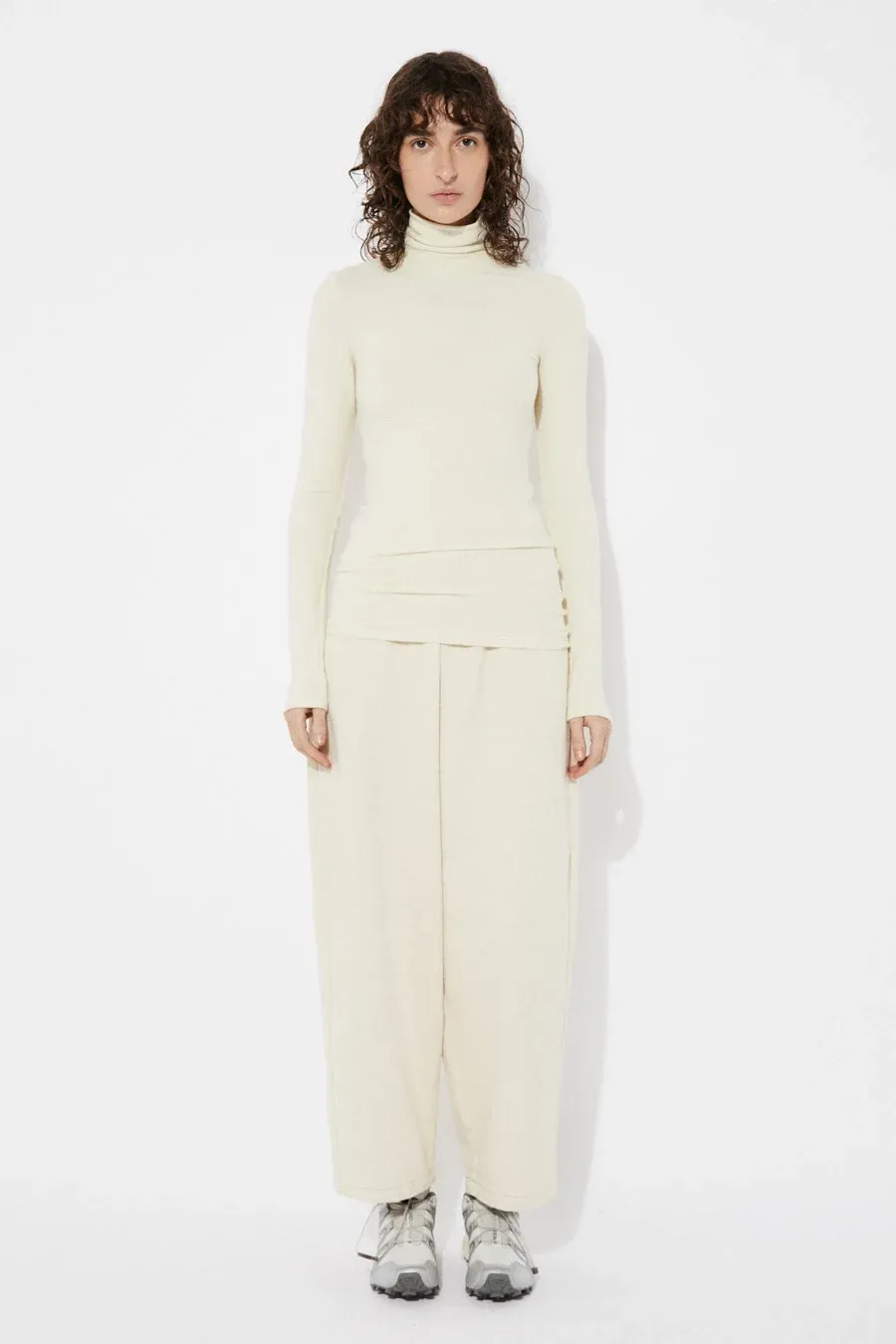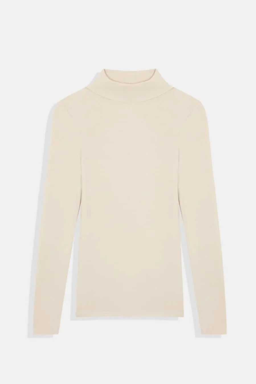 Fitted knit t-shirt featuring a double-layer turtleneck and long sleeves for a sleek, sophisticated look. Crafted from a soft blend of viscose, angora, and elastane, this stylish piece offers both comfort and elegance. Made in Spain. Modeled by Ruth (1.77 m) in size XS.