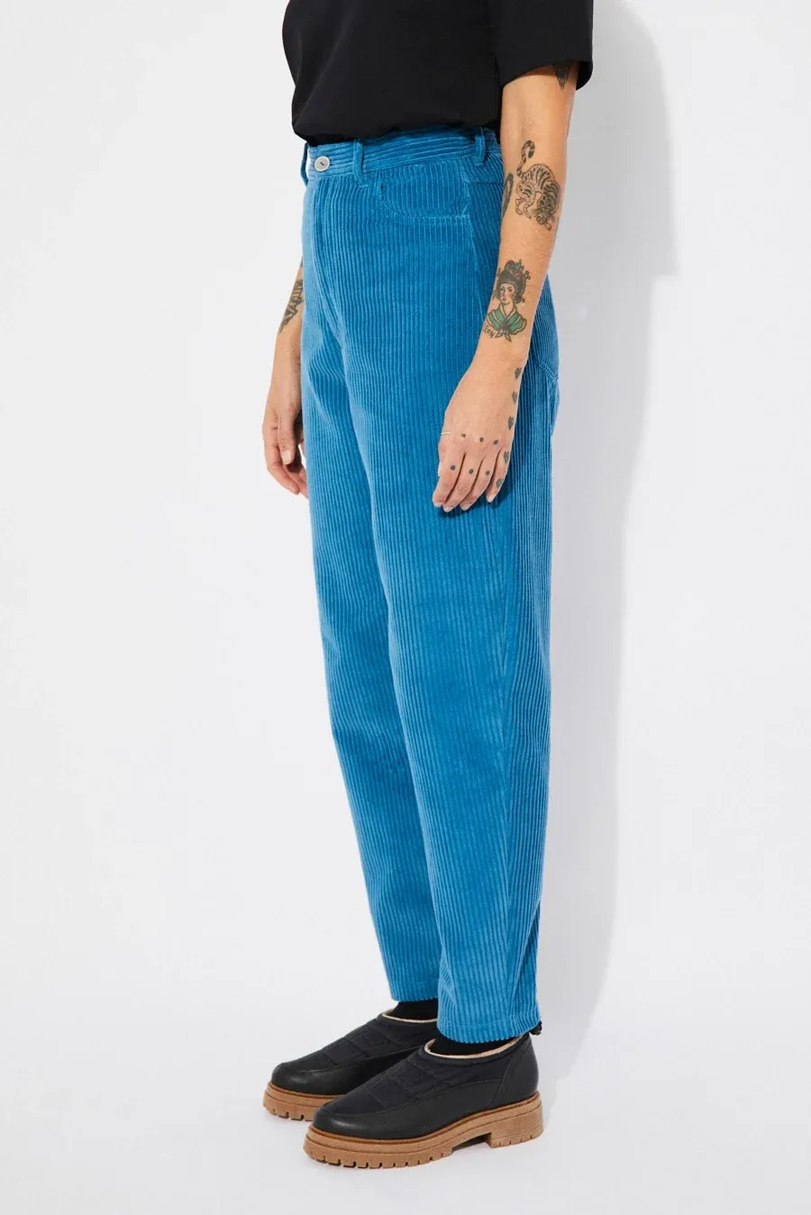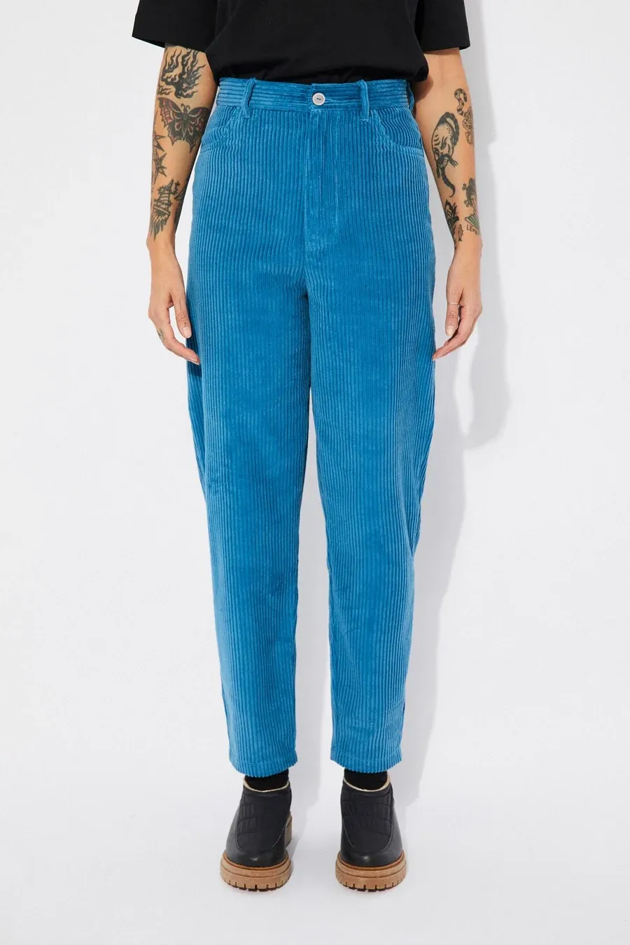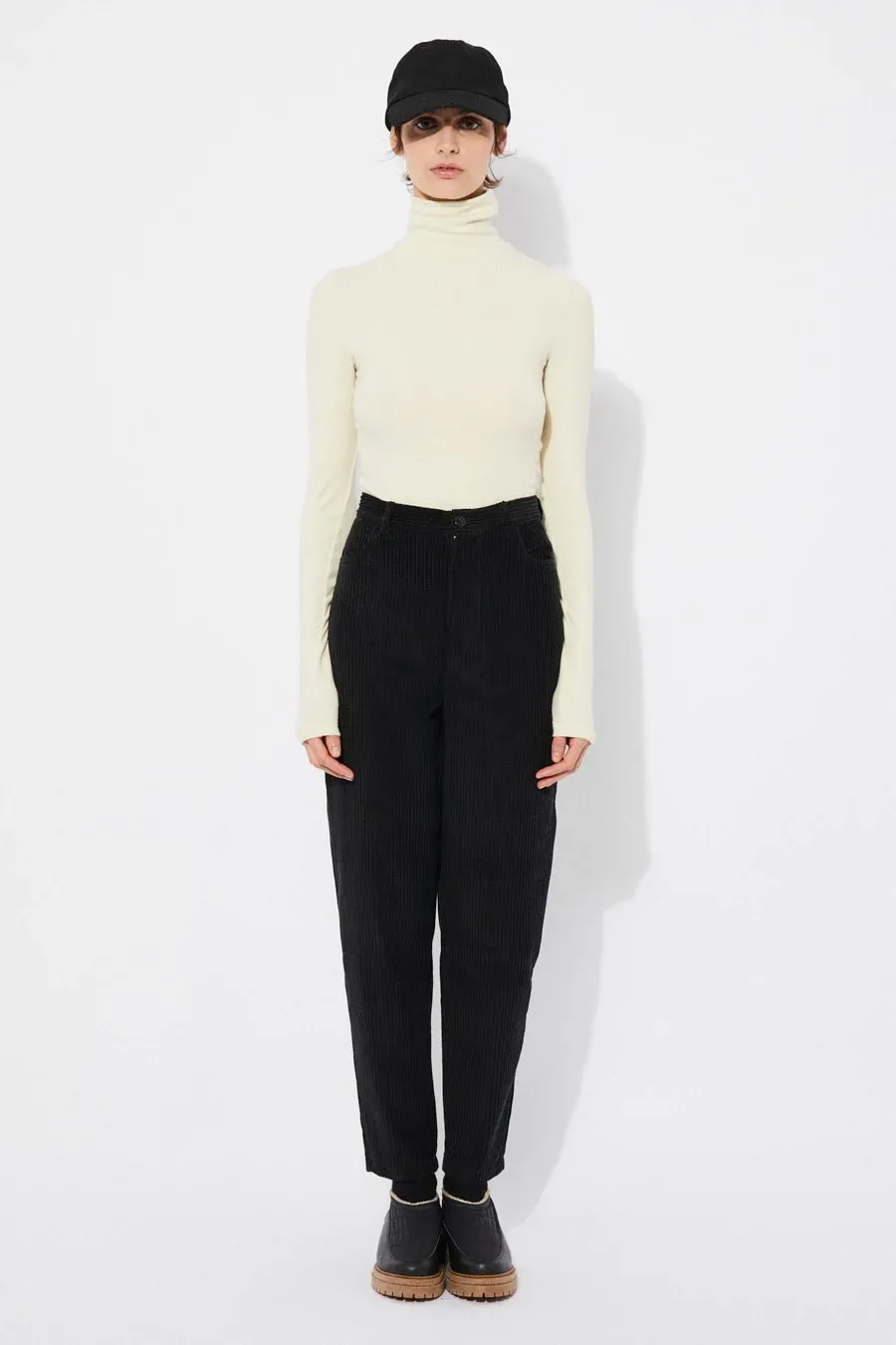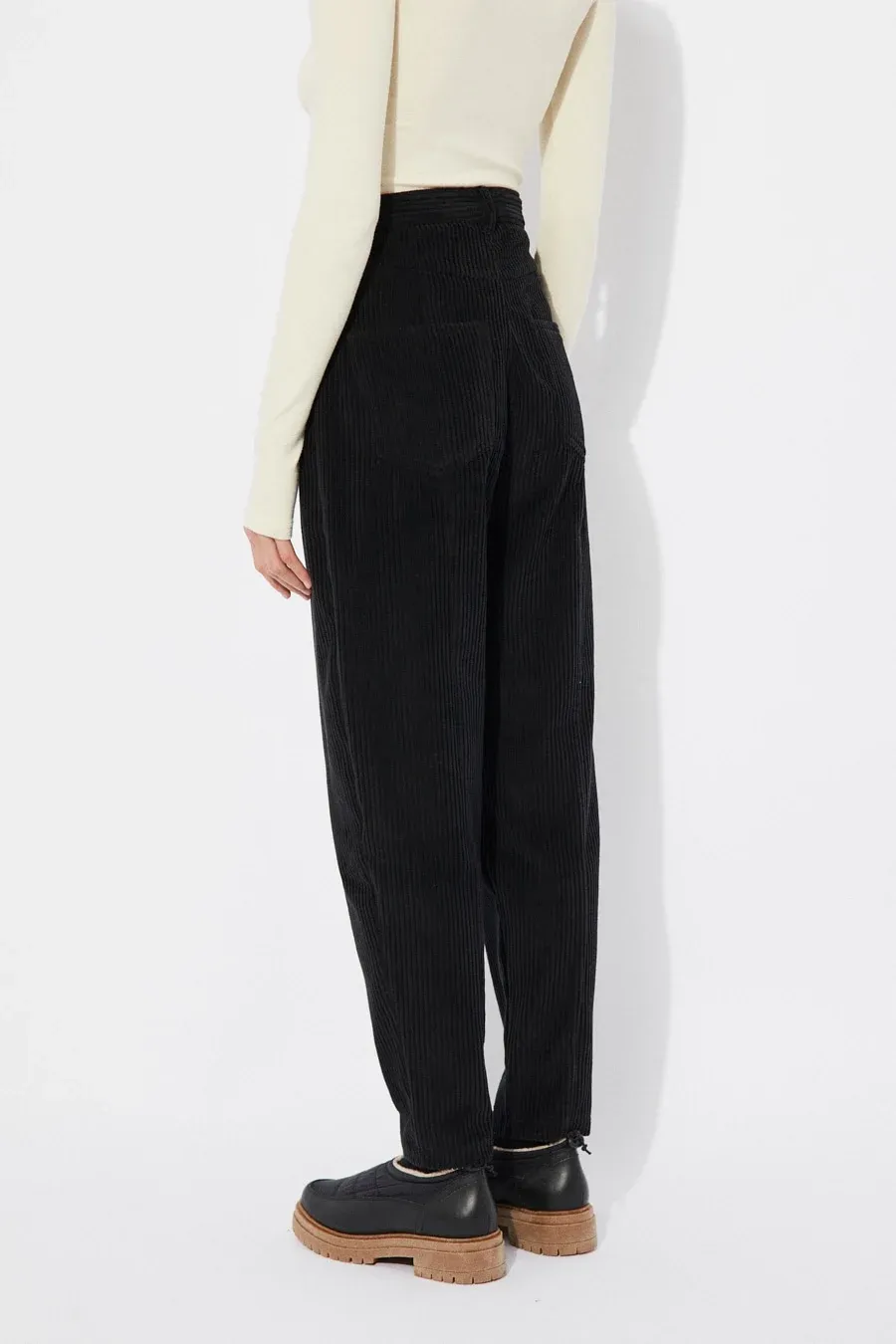 Discover high-waisted cotton corduroy pants with a stylish balloon effect. Features four pockets, zipper closure, and button. Made in Portugal. 100% soft cotton.